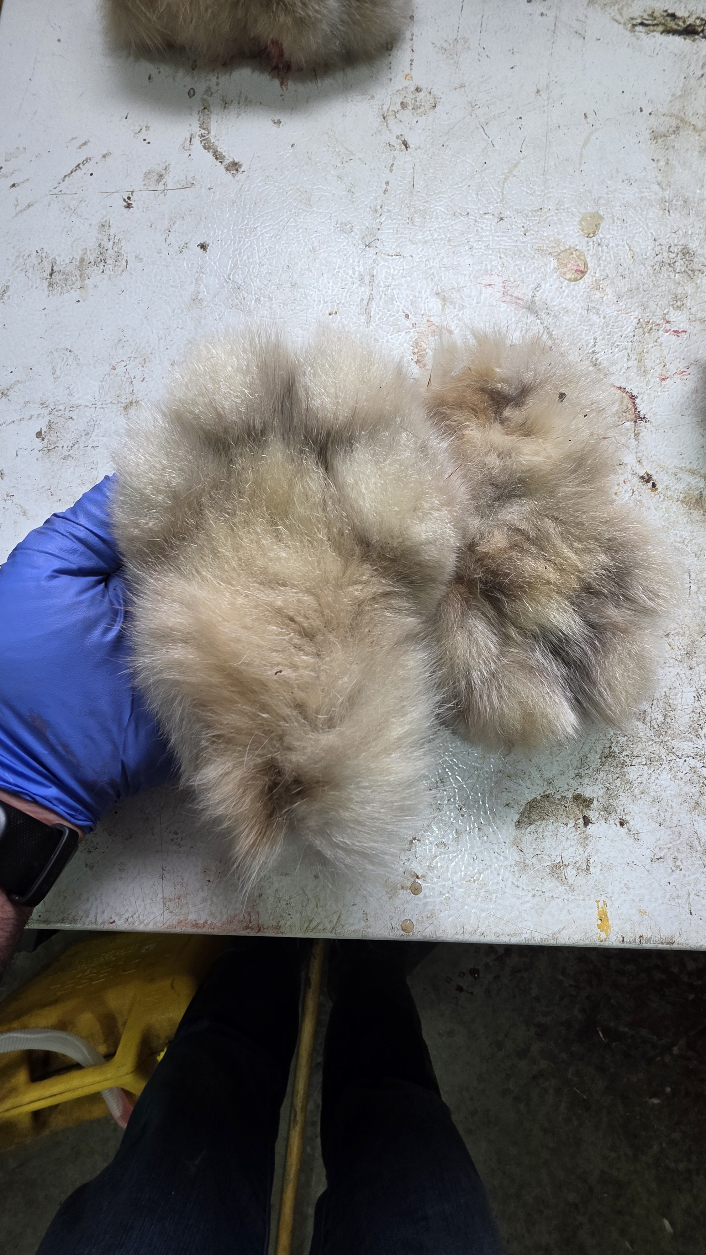 Is it any wonder that a 27 pound cat can walk on top of 3 feet of powder snow? The first picture is the bottom of a lynx paw. I'm always amazed that the pads show in their tracks at all with all that fur. The second picture shows my hand (that is a 2xl glove on it) in between the front paws of a good lynx. The left paw is the top and the right paw shows the bottom.